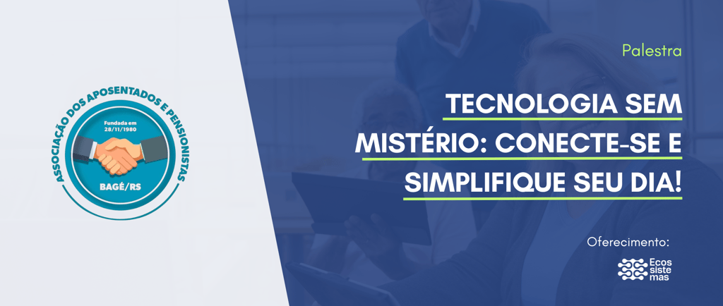 Pensando em como tornar a tecnologia mais acessível e segura para a melhor idade, nós da Ecossistemas, em parceria com Régis Picáz e Guilherme, estamos organizando uma palestra imperdível: "Tecnologia Sem Mistério: Conecte-se e Simplifique Seu Dia!"